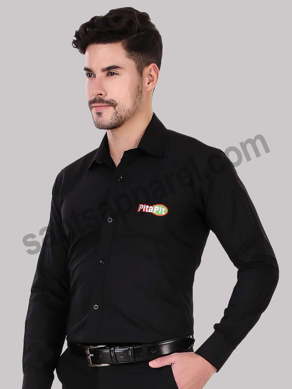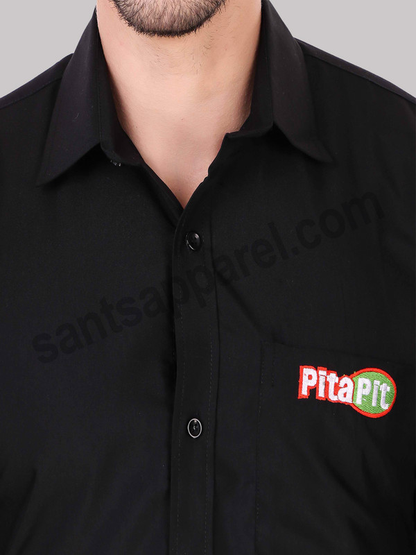 Black Full Sleeve Shirt, made in Polly Cotton Fabric and has logo embroidery for brand visibility, Can be used in Restaurant uniform. Can be pair with Black Trouser for smart look.