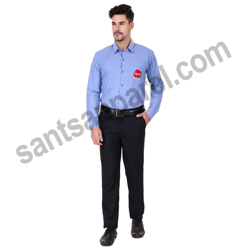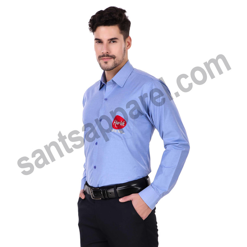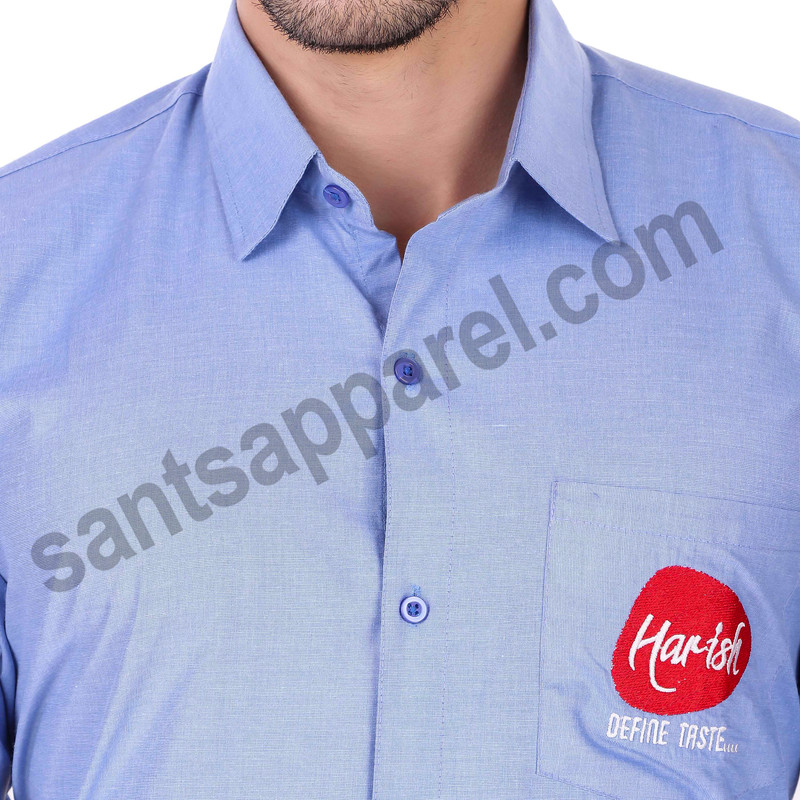 Blue Full sleeve shirt has from pocket and pointed collar, made with PC fabric for more comfort, logo embroidery done for brand visibility. Can be used for restaurant and corporate manager uniform