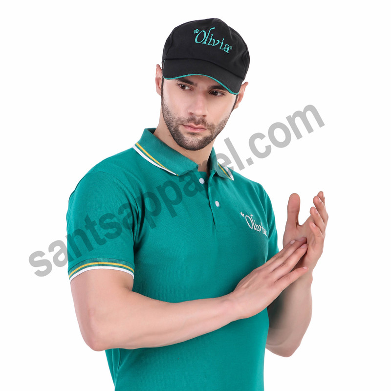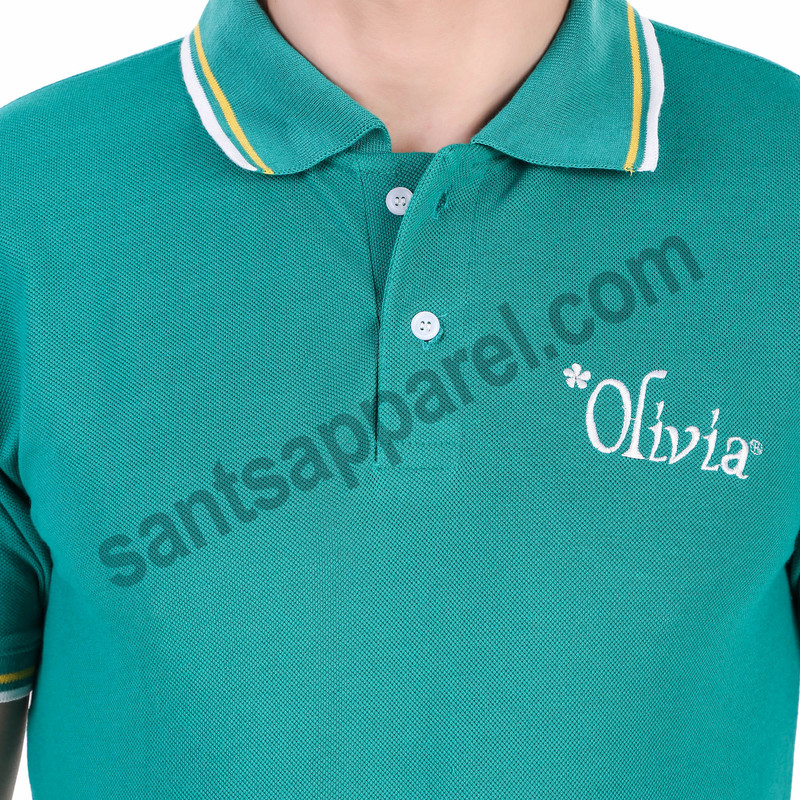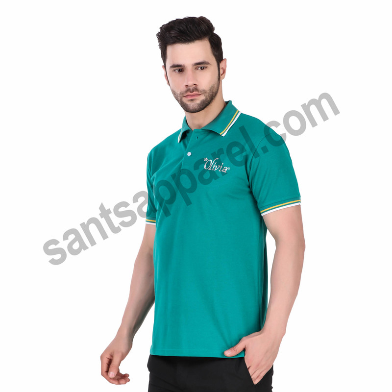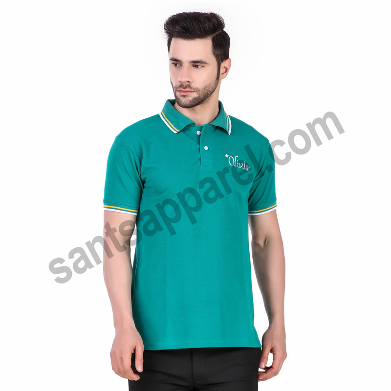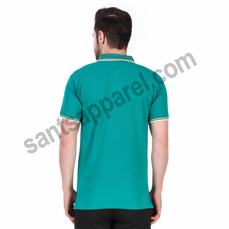 Short sleeves teal blue polo made in Cotton Rich Pique fabric with soft hand feel including embroidery at front and back to increase the brand visibility. Custom designed ribbed collar and cuff matching with the brand colors to create a smart formal corporate look. Available in others colour too.