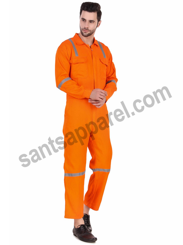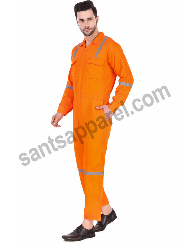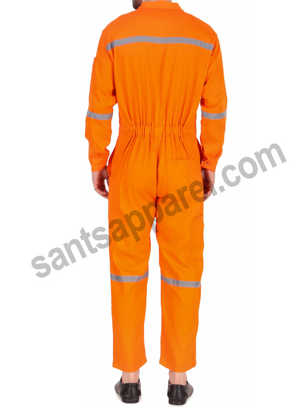 Orange full sleeves workwear coverall made in Poly Viscose fabric, has two front flap pockets with front zipper with a flap, semi elasticated waistband for the perfect with 6 multi utility pockets, reflective tape used for better visibility & safety , branding can be done at front for high brand visibility. Best for manufacturing industries and automobile staff uniform