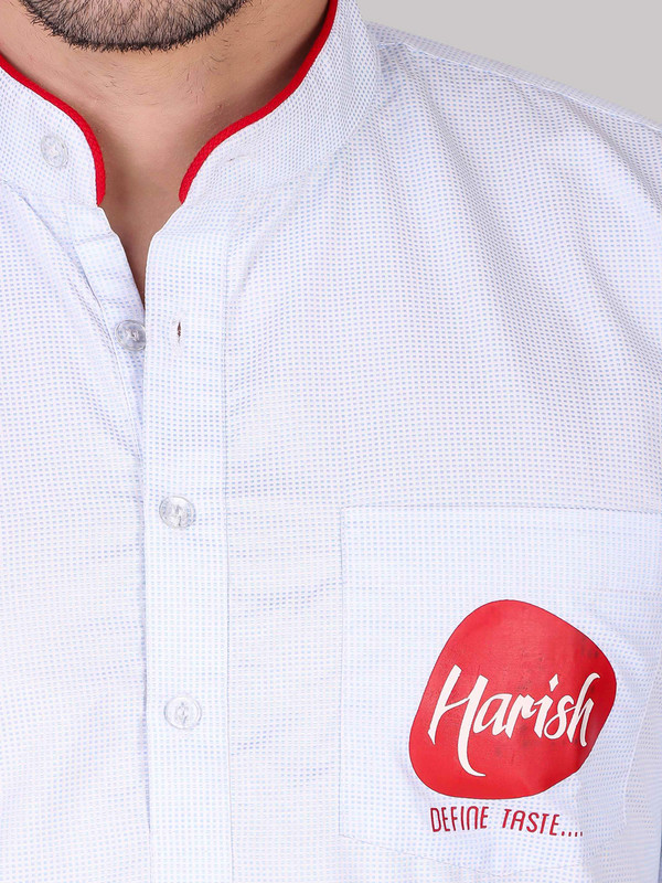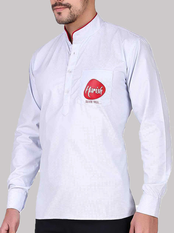 Prince Collar Kurta Look Shirt for fine dining restaurant uniform, made with PC Shirting and logo embroidery done for brand visibility