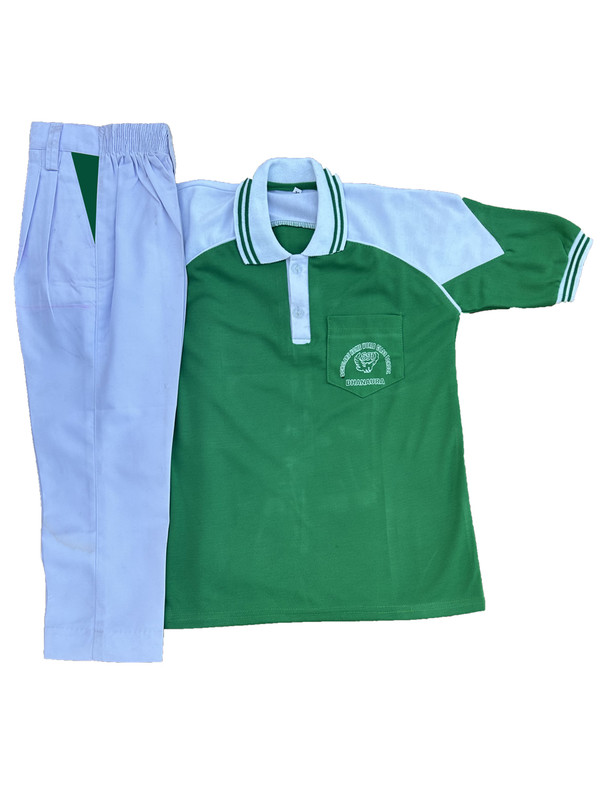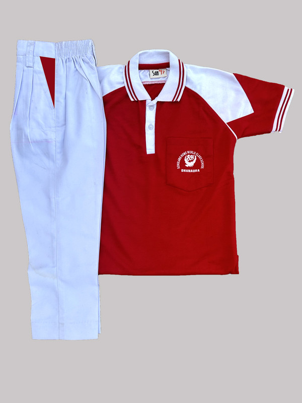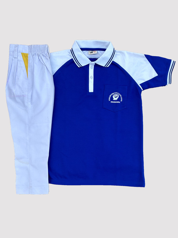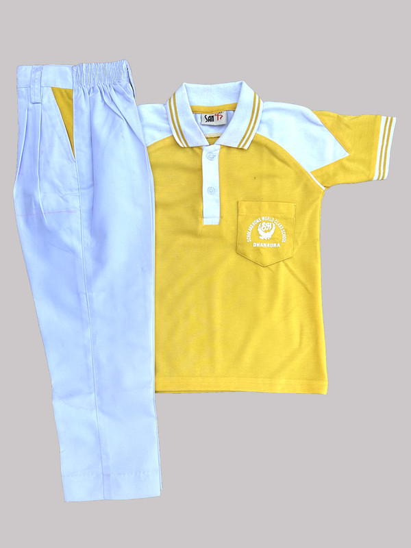 SCHOOL SPORTS & HOUSE UNIFORM T-shirt and PANT. Comfortable and sporty design of school sports or house uniform for your school kids, This article has tshirt in four colour (YELLOW, GREEN, SKY AND RED). T-shirts are made in cotton Matty fabric. These tshirts has pockets and school logo printing is done on pockets. These tshirts are paired with Cotton white full pant with colour contrast pockets. Available in more colours.