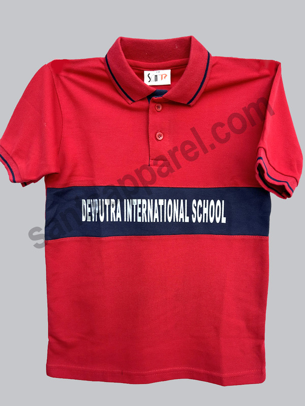 SCHOOL HOUSE UNIFORM T-shirt and Lower, Comfortable and sporty design of school house uniform for your smart school kids, It has very comfortable and sporty gold yellow colour school tshirt, collar or polo Tshirt in half sleeve, Cotton Matty fabric, has two button with customized knitted collar & sleeve cuff, Tshirt has front left to right pannel in navy blue colour and school name printing is done on it, Tshirt back – School name. This school house uniform pair has got stylish and sporty lower in cotton matty, red stripes on lower to get the perfect match with the tshirt colour. Available in more colours – RED, Green, blue, royal blue and etc.