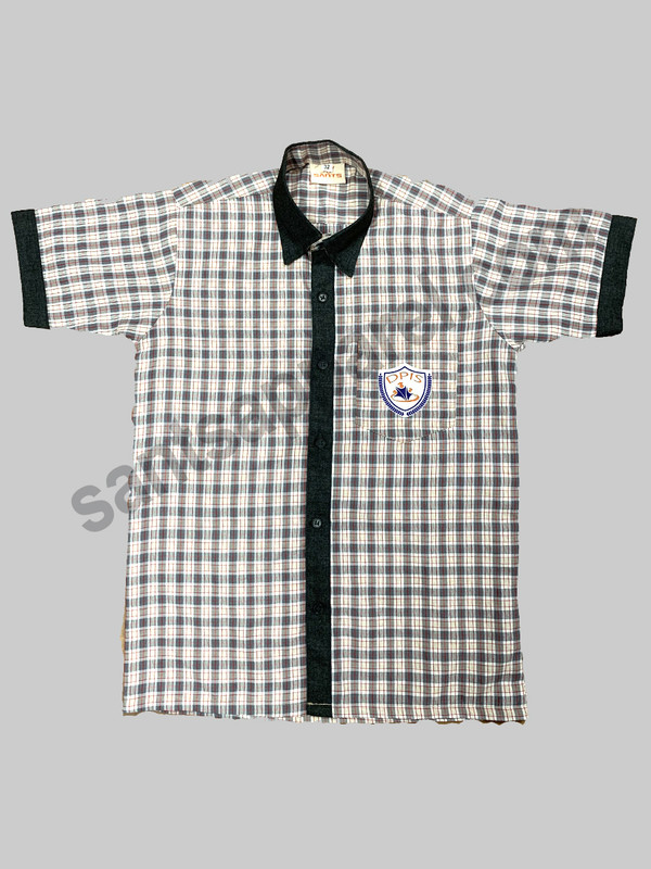 SCHOOL UNIFORM Check SHIRT & PANT, This school uniform pair has got cotton check shirt in half sleeve for school kids, front button strip, sleeves cuffs & collar are customised with mixture grey fabric, School logo printing on shirt pocket. Shirt is paired with Full pant in cotton fabric, Pant colour is mixture grey with contrast colour pockets to get perfect match with the School Shirt, Available in more colours and can be manufactured/customised in other colours & fabrics too.