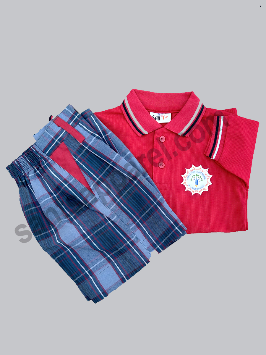 SCHOOL UNIFORM T-shirt & Half Pant, Comfortable and smart design of school uniform for your smart school kids, It has very comfortable and eye catchy RED color school collar & polo T-shirt in half sleeve, Cotton Matty fabric, has two button with customized knitted collar & sleeve cuff, school logo printing along with customized school nicker in check or school uniform check half pant, having red pocket contrast color to get the perfect match with school t-shirt